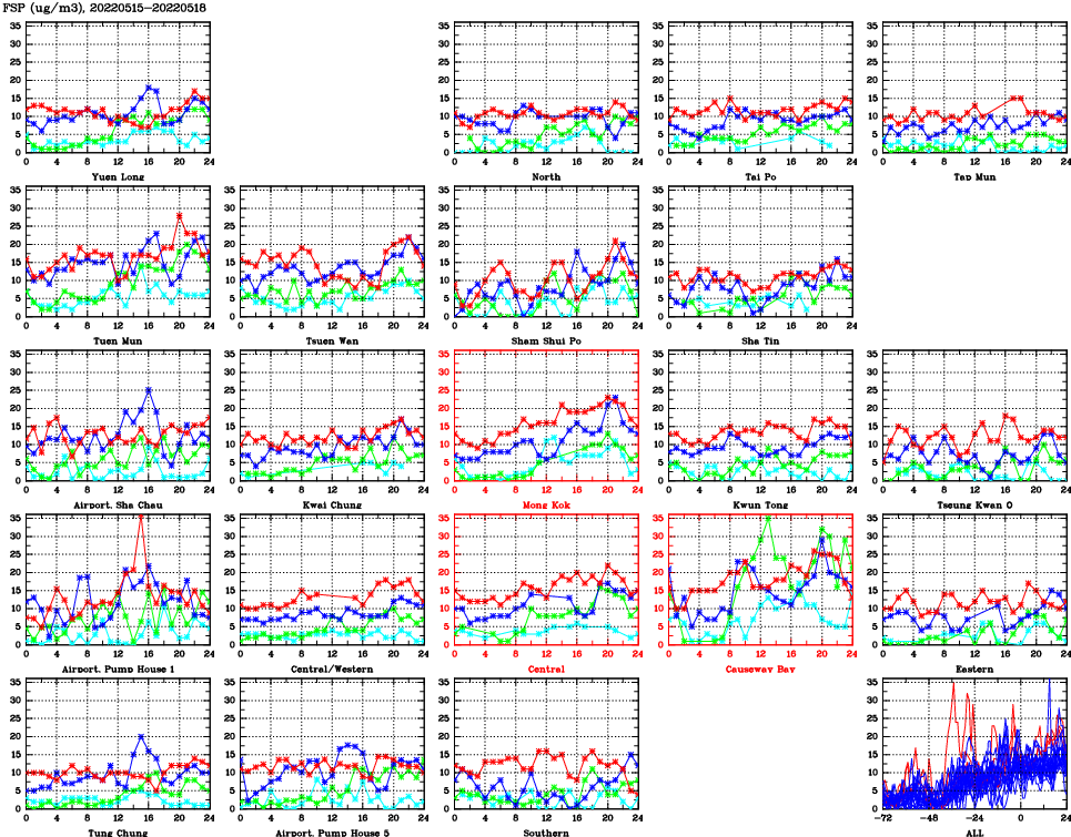 | Air Quality Data Time Series for FSP (2022/05/18) | ( Line colors: Day -3 Day -2 Day -1 Current day ) | 2D Map Current AQHI |