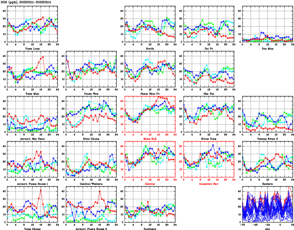| Air Quality Data Time Series for NO2 (2022/05/14) | ( Line colors: Day -3 Day -2 Day -1 Current day ) | 2D Map Current AQHI |