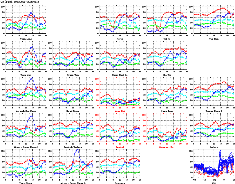 | Air Quality Data Time Series for O3 (2022/05/18) | ( Line colors: Day -3 Day -2 Day -1 Current day ) | 2D Map Current AQHI |