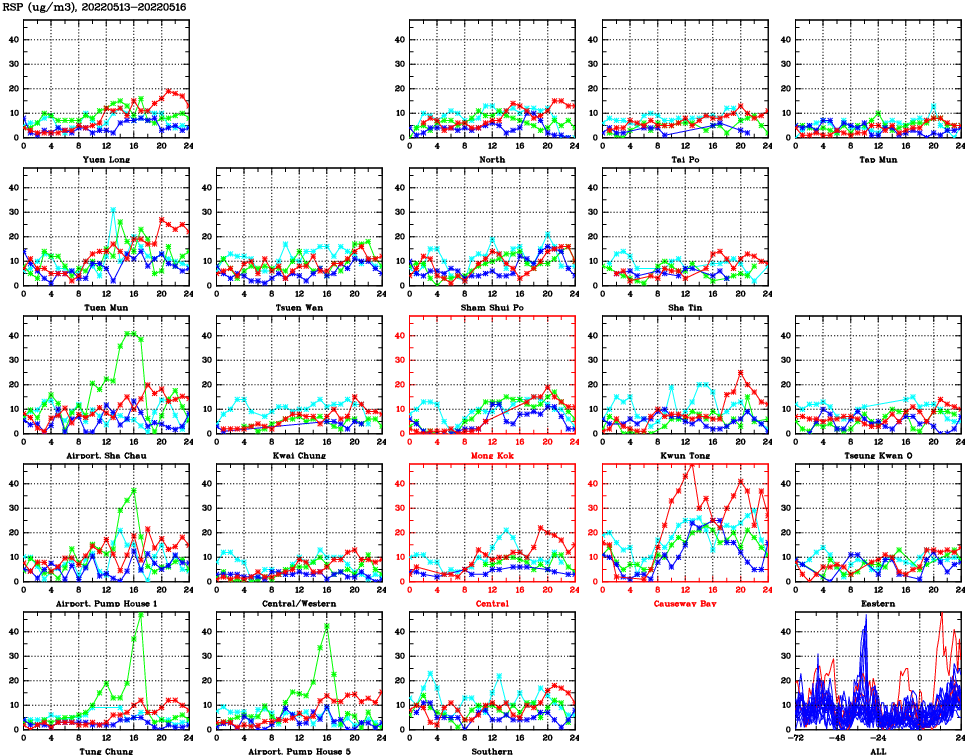 | Air Quality Data Time Series for RSP (2022/05/16) | ( Line colors: Day -3 Day -2 Day -1 Current day ) | 2D Map Current AQHI |