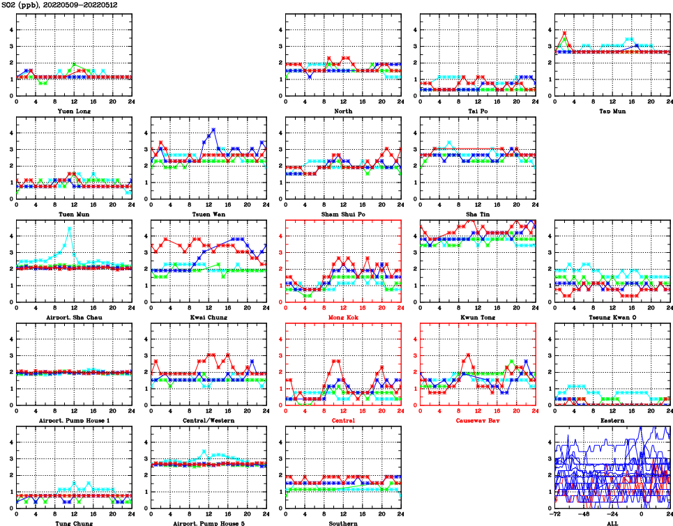 | Air Quality Data Time Series for SO2 (2022/05/12) | ( Line colors: Day -3 Day -2 Day -1 Current day ) | 2D Map Current AQHI |
