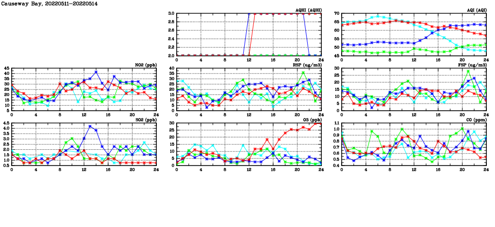 | Air Quality Data Time Series in Causeway Bay (2022/05/14) | ( Line colors: Day -3 Day -2 Day -1 Current day ) | 2D Map Current AQHI |