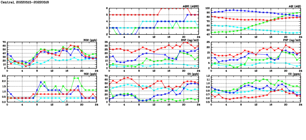| Air Quality Data Time Series in Central (2022/05/18) | ( Line colors: Day -3 Day -2 Day -1 Current day ) | 2D Map Current AQHI |