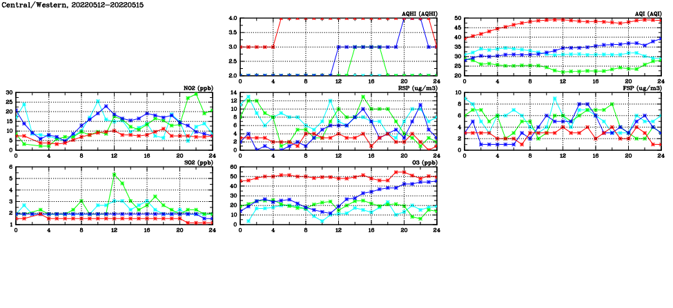 | Air Quality Data Time Series in Central/Western (2022/05/15) | ( Line colors: Day -3 Day -2 Day -1 Current day ) | 2D Map Current AQHI |