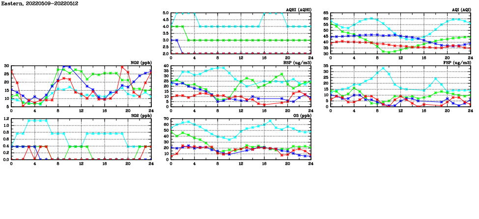 | Air Quality Data Time Series in Eastern (2022/05/12) | ( Line colors: Day -3 Day -2 Day -1 Current day ) | 2D Map Current AQHI |