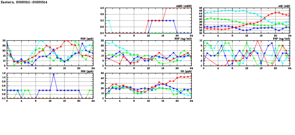 | Air Quality Data Time Series in Eastern (2022/05/14) | ( Line colors: Day -3 Day -2 Day -1 Current day ) | 2D Map Current AQHI |