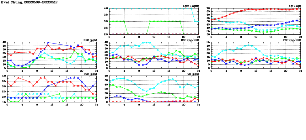 | Air Quality Data Time Series in Kwai Chung (2022/05/12) | ( Line colors: Day -3 Day -2 Day -1 Current day ) | 2D Map Current AQHI |