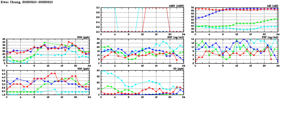 | Air Quality Data Time Series in Kwai Chung (2022/05/13) | ( Line colors: Day -3 Day -2 Day -1 Current day ) | 2D Map Current AQHI |