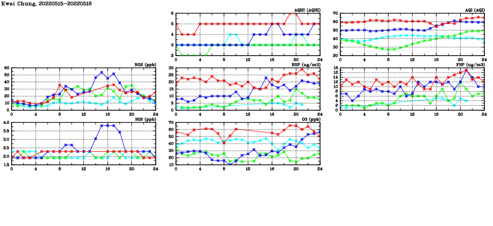 | Air Quality Data Time Series in Kwai Chung (2022/05/18) | ( Line colors: Day -3 Day -2 Day -1 Current day ) | 2D Map Current AQHI |