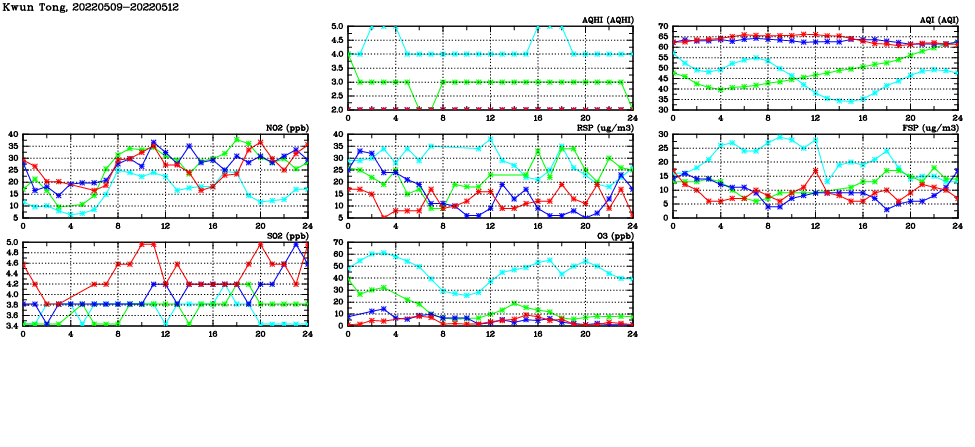| Air Quality Data Time Series in Kwun Tong (2022/05/12) | ( Line colors: Day -3 Day -2 Day -1 Current day ) | 2D Map Current AQHI |