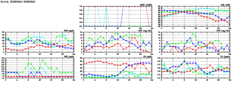 | Air Quality Data Time Series in North (2022/05/15) | ( Line colors: Day -3 Day -2 Day -1 Current day ) | 2D Map Current AQHI |