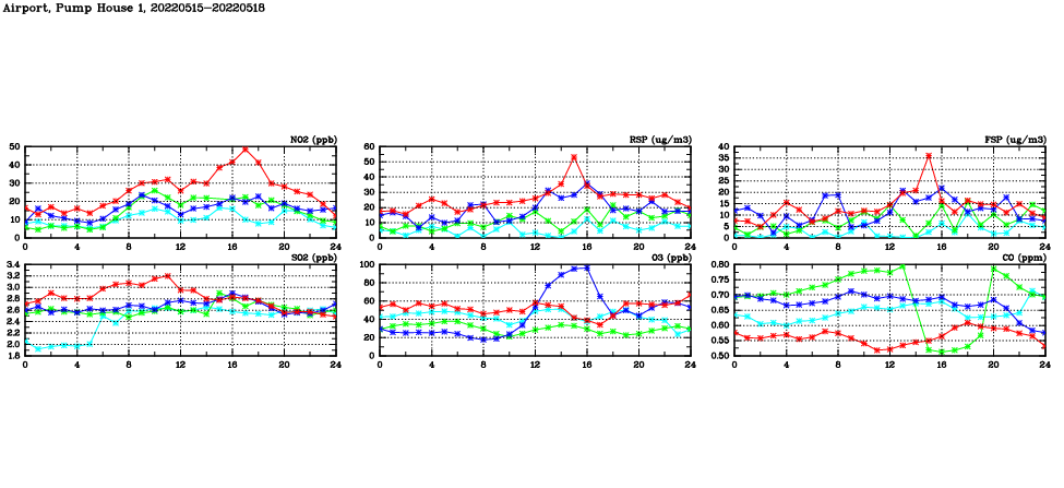 | Air Quality Data Time Series in Airport, Pump House 1 (2022/05/18) | ( Line colors: Day -3 Day -2 Day -1 Current day ) | 2D Map Current AQHI |