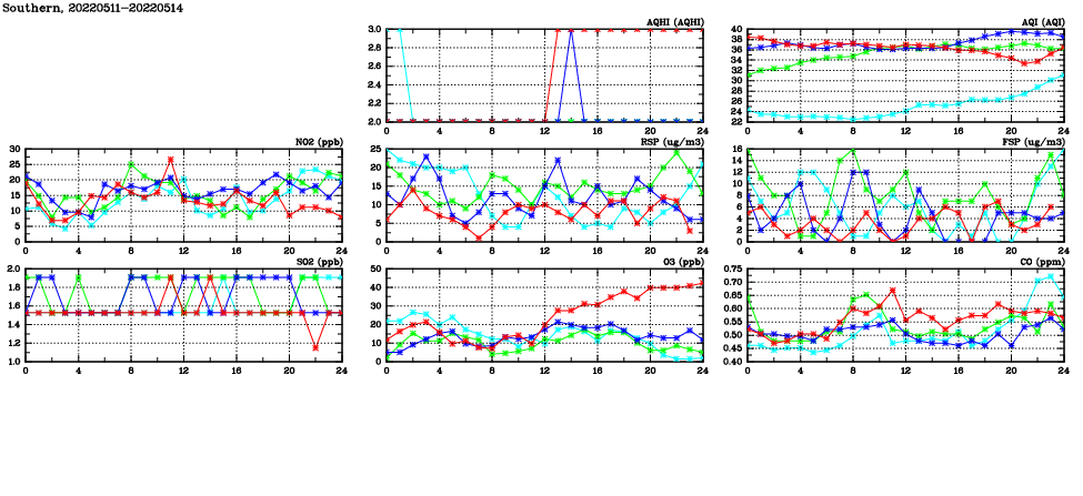 | Air Quality Data Time Series in Southern (2022/05/14) | ( Line colors: Day -3 Day -2 Day -1 Current day ) | 2D Map Current AQHI |