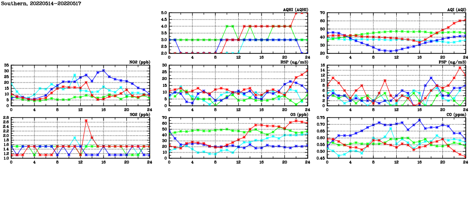 | Air Quality Data Time Series in Southern (2022/05/17) | ( Line colors: Day -3 Day -2 Day -1 Current day ) | 2D Map Current AQHI |