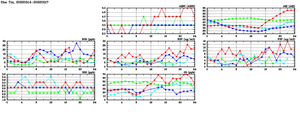 | Air Quality Data Time Series in Sha Tin (2022/05/17) | ( Line colors: Day -3 Day -2 Day -1 Current day ) | 2D Map Current AQHI |