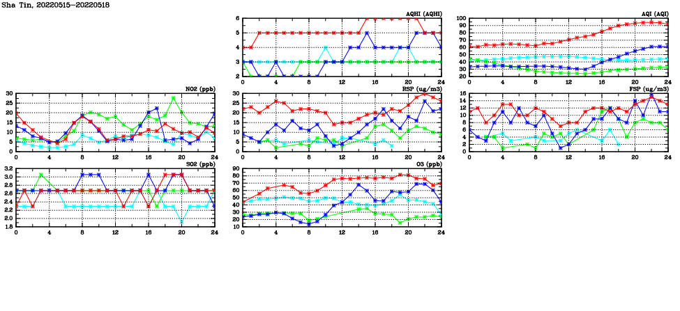 | Air Quality Data Time Series in Sha Tin (2022/05/18) | ( Line colors: Day -3 Day -2 Day -1 Current day ) | 2D Map Current AQHI |