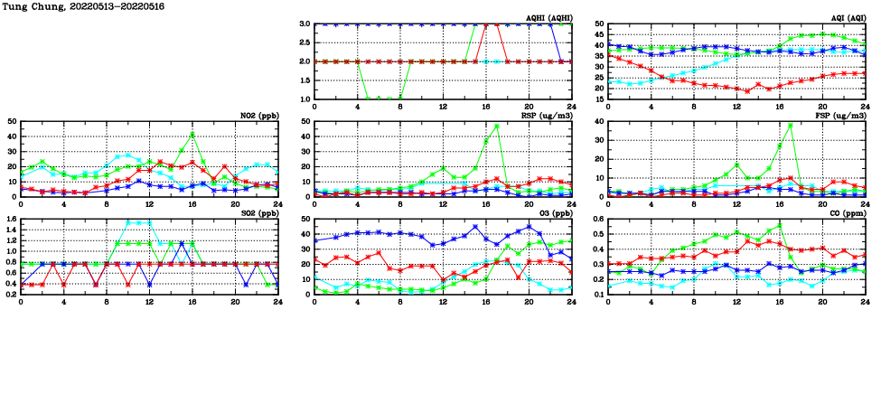 | Air Quality Data Time Series in Tung Chung (2022/05/16) | ( Line colors: Day -3 Day -2 Day -1 Current day ) | 2D Map Current AQHI |