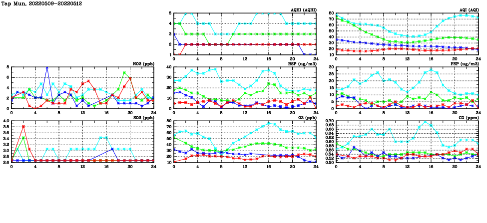 | Air Quality Data Time Series in Tap Mun (2022/05/12) | ( Line colors: Day -3 Day -2 Day -1 Current day ) | 2D Map Current AQHI |