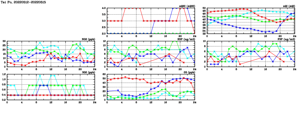 | Air Quality Data Time Series in Tai Po (2022/05/15) | ( Line colors: Day -3 Day -2 Day -1 Current day ) | 2D Map Current AQHI |