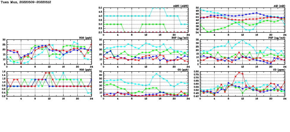 | Air Quality Data Time Series in Tuen Mun (2022/05/12) | ( Line colors: Day -3 Day -2 Day -1 Current day ) | 2D Map Current AQHI |