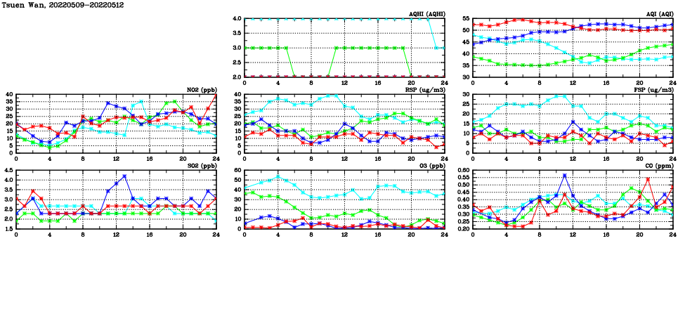 | Air Quality Data Time Series in Tsuen Wan (2022/05/12) | ( Line colors: Day -3 Day -2 Day -1 Current day ) | 2D Map Current AQHI |