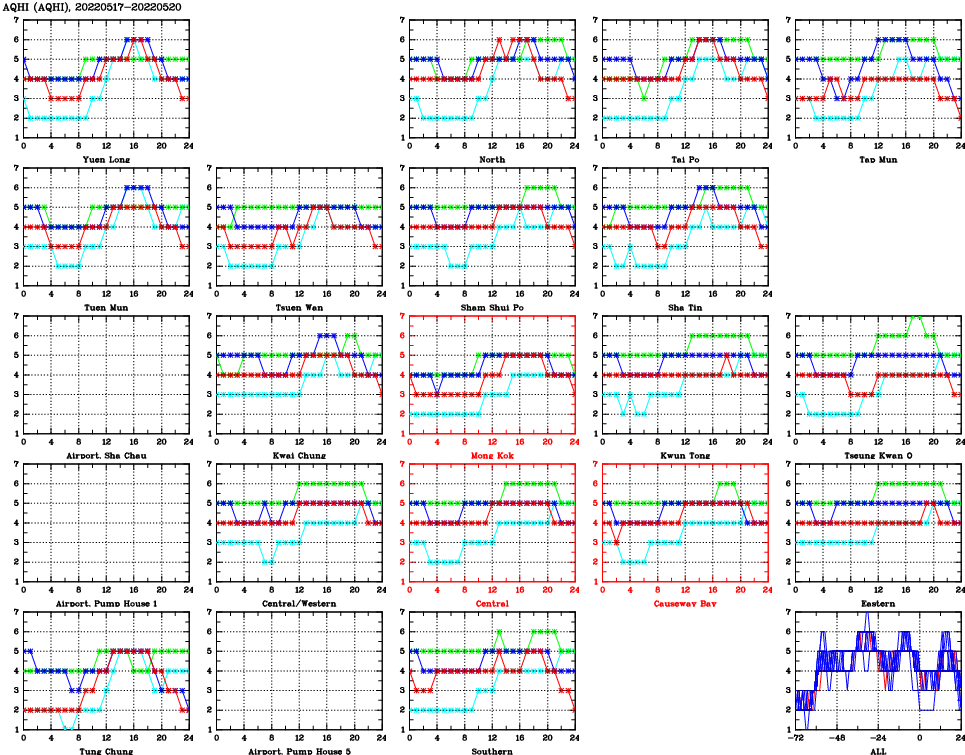 | Air Quality Data Time Series for AQHI (2022/05/20) | ( Line colors: Day -3 Day -2 Day -1 Current day ) | 2D Map Current AQHI |