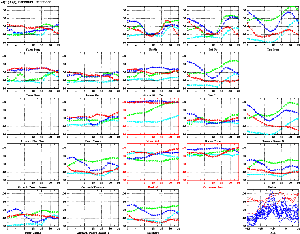 | Air Quality Data Time Series for AQI (2022/05/20) | ( Line colors: Day -3 Day -2 Day -1 Current day ) | 2D Map Current AQHI |