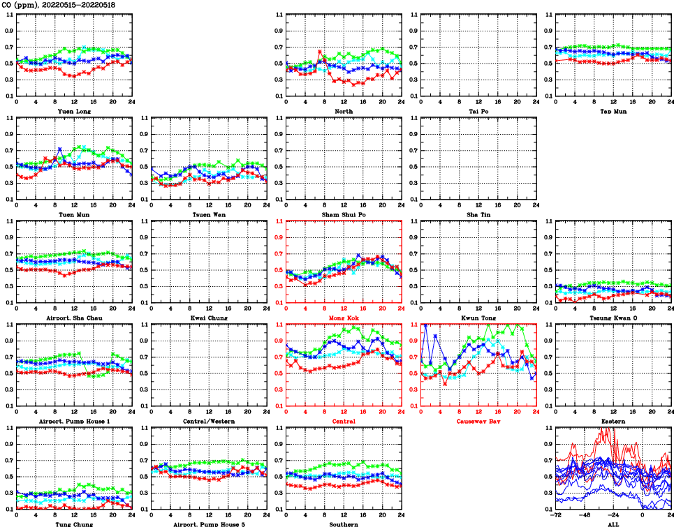 | Air Quality Data Time Series for CO (2022/05/18) | ( Line colors: Day -3 Day -2 Day -1 Current day ) | 2D Map Current AQHI |