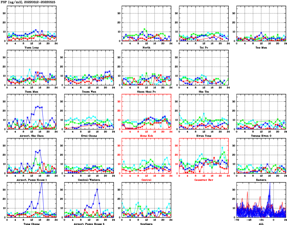 | Air Quality Data Time Series for FSP (2022/05/15) | ( Line colors: Day -3 Day -2 Day -1 Current day ) | 2D Map Current AQHI |