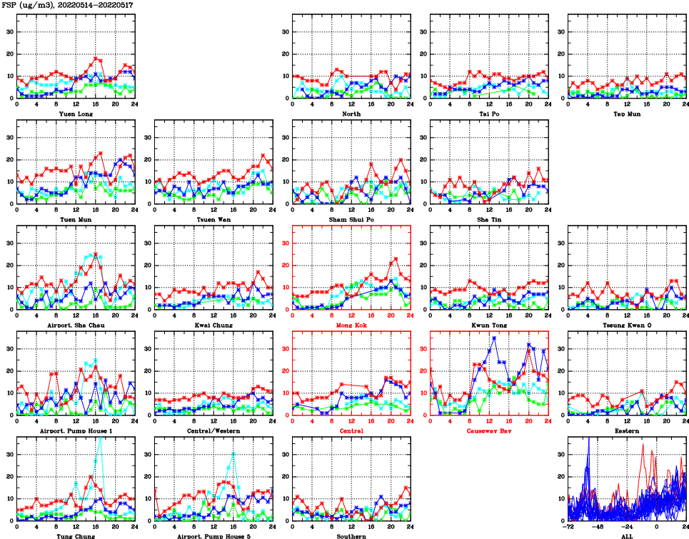 | Air Quality Data Time Series for FSP (2022/05/17) | ( Line colors: Day -3 Day -2 Day -1 Current day ) | 2D Map Current AQHI |