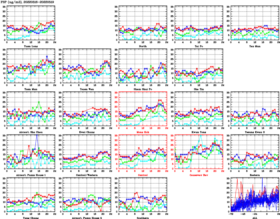 | Air Quality Data Time Series for FSP (2022/05/19) | ( Line colors: Day -3 Day -2 Day -1 Current day ) | 2D Map Current AQHI |