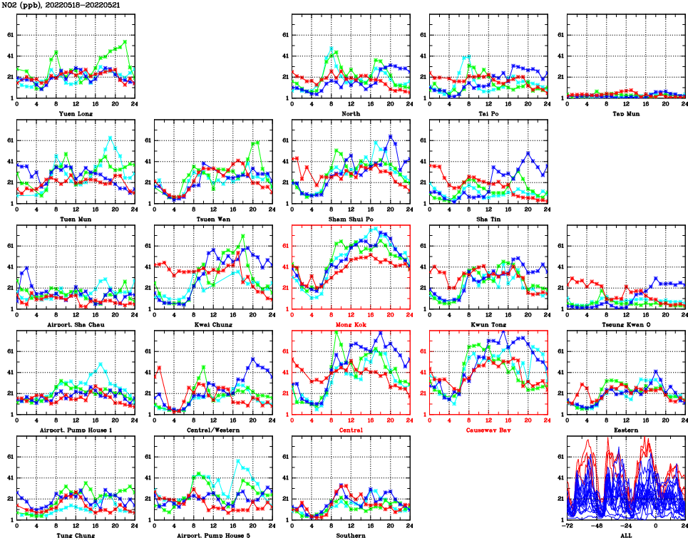 | Air Quality Data Time Series for NO2 (2022/05/21) | ( Line colors: Day -3 Day -2 Day -1 Current day ) | 2D Map Current AQHI |