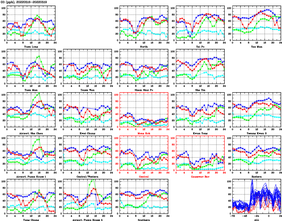| Air Quality Data Time Series for O3 (2022/05/19) | ( Line colors: Day -3 Day -2 Day -1 Current day ) | 2D Map Current AQHI |