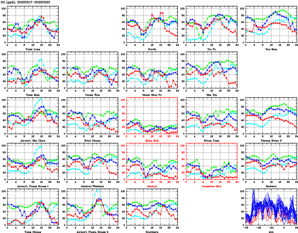 | Air Quality Data Time Series for O3 (2022/05/20) | ( Line colors: Day -3 Day -2 Day -1 Current day ) | 2D Map Current AQHI |