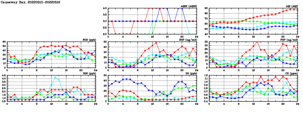 | Air Quality Data Time Series in Causeway Bay (2022/05/16) | ( Line colors: Day -3 Day -2 Day -1 Current day ) | 2D Map Current AQHI |