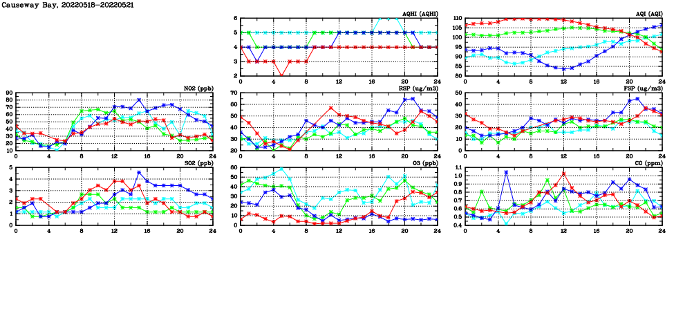| Air Quality Data Time Series in Causeway Bay (2022/05/21) | ( Line colors: Day -3 Day -2 Day -1 Current day ) | 2D Map Current AQHI |