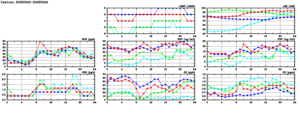 | Air Quality Data Time Series in Central (2022/05/19) | ( Line colors: Day -3 Day -2 Day -1 Current day ) | 2D Map Current AQHI |