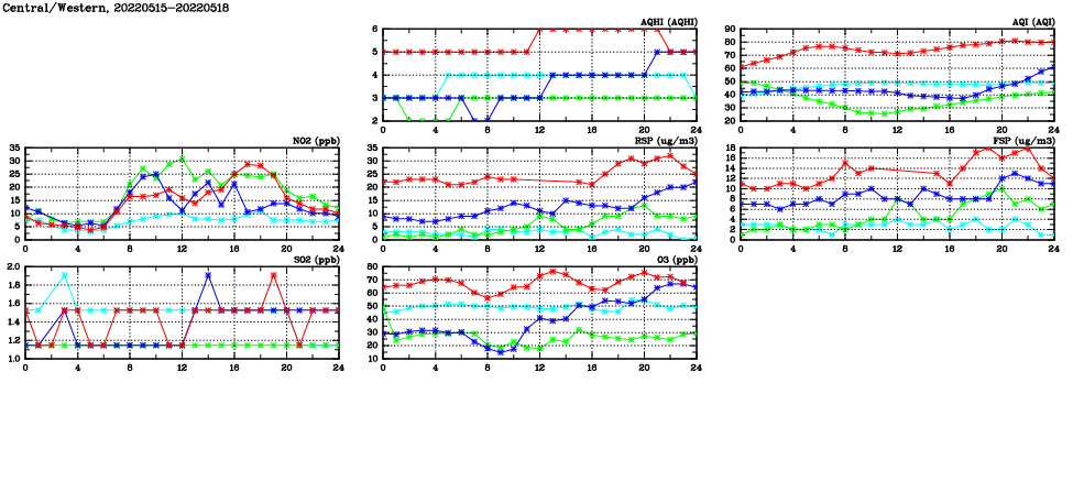| Air Quality Data Time Series in Central/Western (2022/05/18) | ( Line colors: Day -3 Day -2 Day -1 Current day ) | 2D Map Current AQHI |