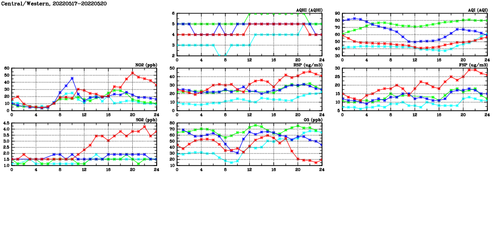 | Air Quality Data Time Series in Central/Western (2022/05/20) | ( Line colors: Day -3 Day -2 Day -1 Current day ) | 2D Map Current AQHI |