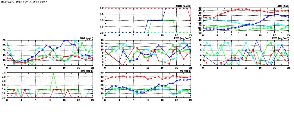 | Air Quality Data Time Series in Eastern (2022/05/15) | ( Line colors: Day -3 Day -2 Day -1 Current day ) | 2D Map Current AQHI |