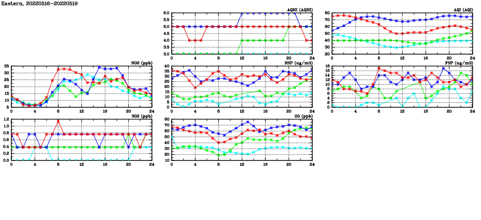 | Air Quality Data Time Series in Eastern (2022/05/19) | ( Line colors: Day -3 Day -2 Day -1 Current day ) | 2D Map Current AQHI |