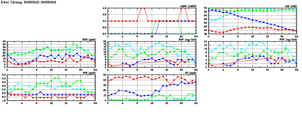 | Air Quality Data Time Series in Kwai Chung (2022/05/15) | ( Line colors: Day -3 Day -2 Day -1 Current day ) | 2D Map Current AQHI |