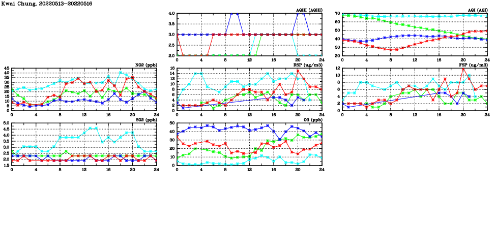 | Air Quality Data Time Series in Kwai Chung (2022/05/16) | ( Line colors: Day -3 Day -2 Day -1 Current day ) | 2D Map Current AQHI |