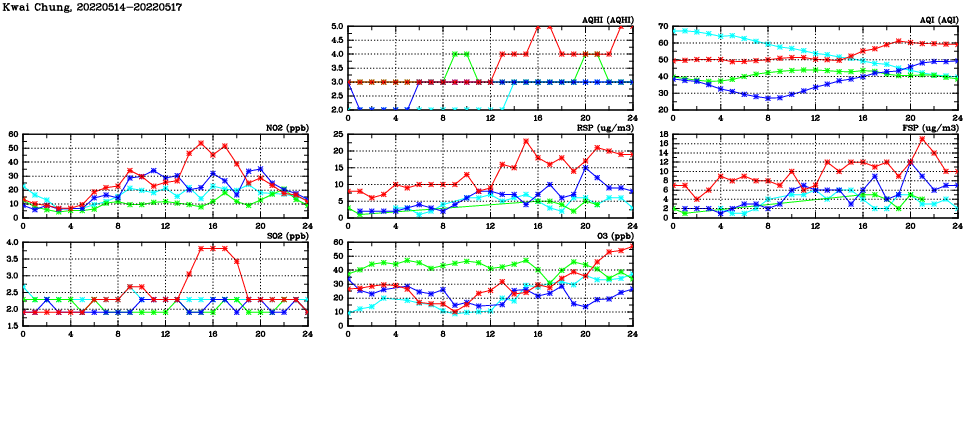 | Air Quality Data Time Series in Kwai Chung (2022/05/17) | ( Line colors: Day -3 Day -2 Day -1 Current day ) | 2D Map Current AQHI |