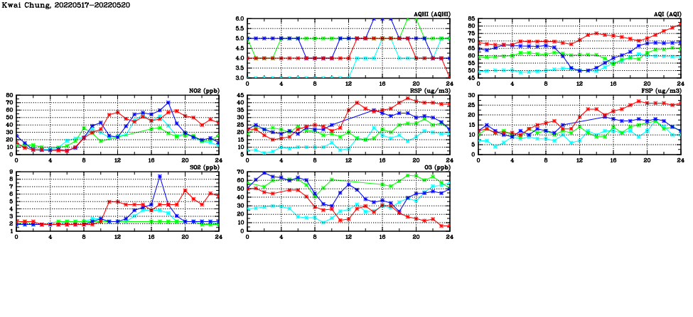| Air Quality Data Time Series in Kwai Chung (2022/05/20) | ( Line colors: Day -3 Day -2 Day -1 Current day ) | 2D Map Current AQHI |