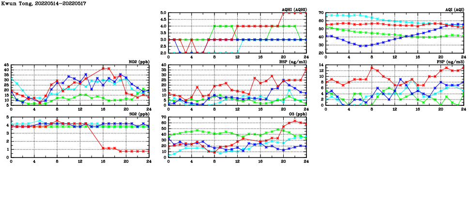 | Air Quality Data Time Series in Kwun Tong (2022/05/17) | ( Line colors: Day -3 Day -2 Day -1 Current day ) | 2D Map Current AQHI |