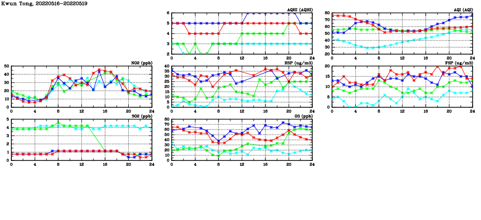| Air Quality Data Time Series in Kwun Tong (2022/05/19) | ( Line colors: Day -3 Day -2 Day -1 Current day ) | 2D Map Current AQHI |