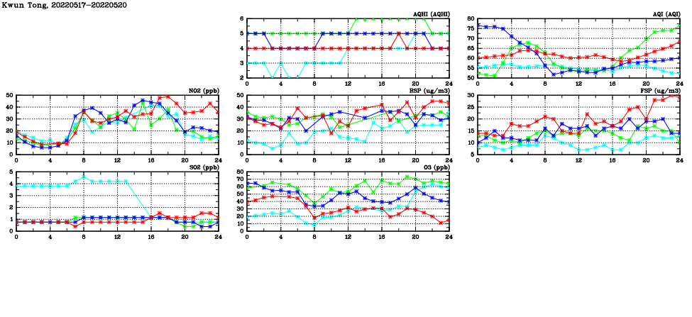 | Air Quality Data Time Series in Kwun Tong (2022/05/20) | ( Line colors: Day -3 Day -2 Day -1 Current day ) | 2D Map Current AQHI |