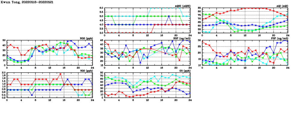 | Air Quality Data Time Series in Kwun Tong (2022/05/21) | ( Line colors: Day -3 Day -2 Day -1 Current day ) | 2D Map Current AQHI |