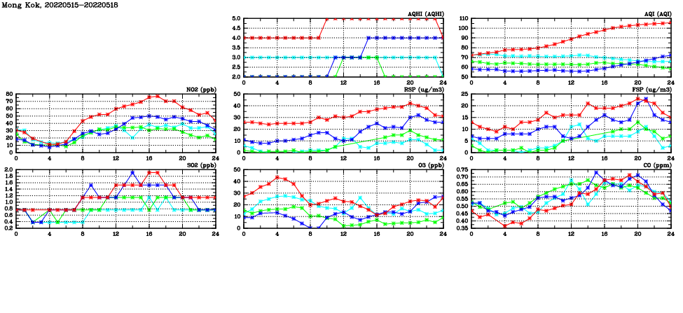 | Air Quality Data Time Series in Mong Kok (2022/05/18) | ( Line colors: Day -3 Day -2 Day -1 Current day ) | 2D Map Current AQHI |